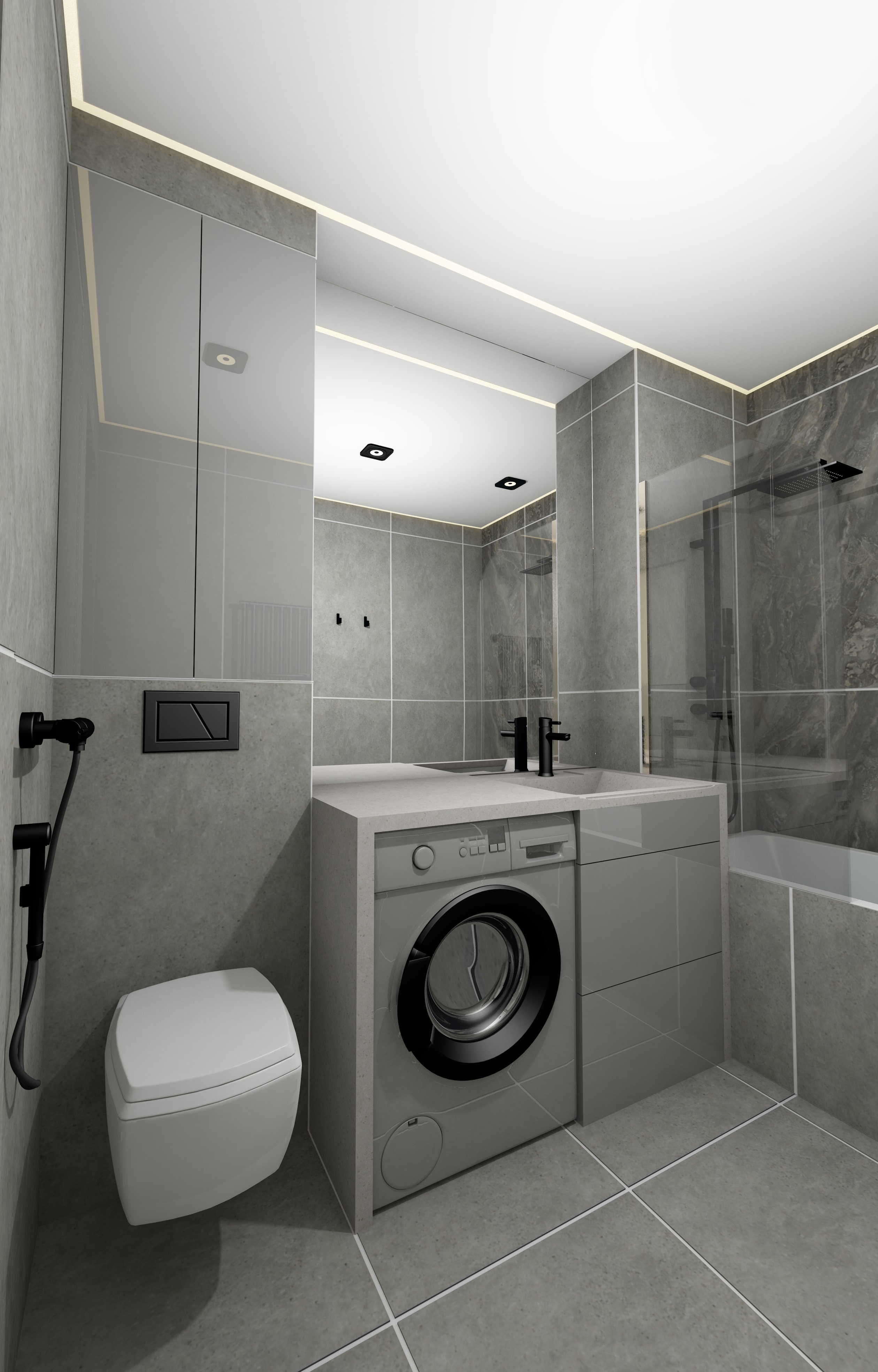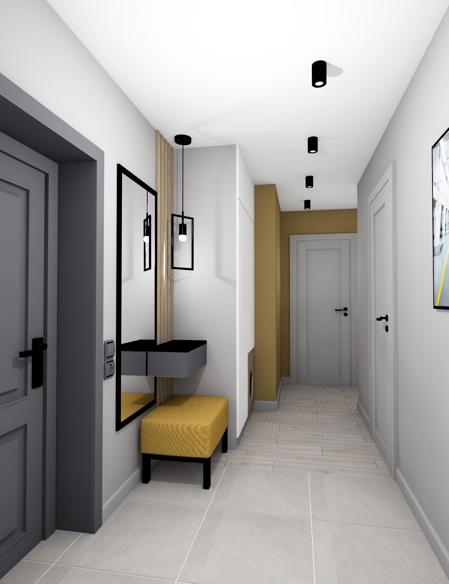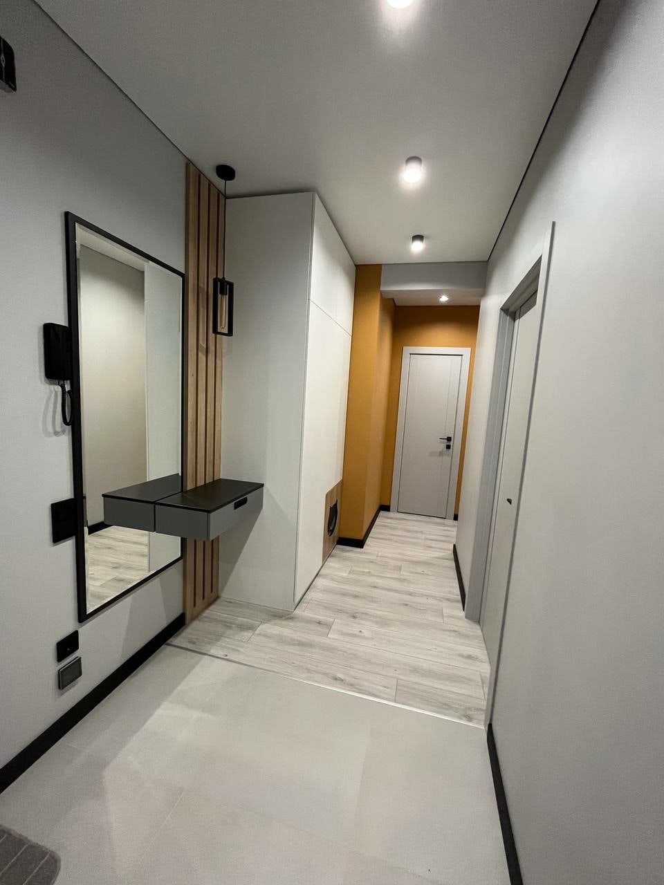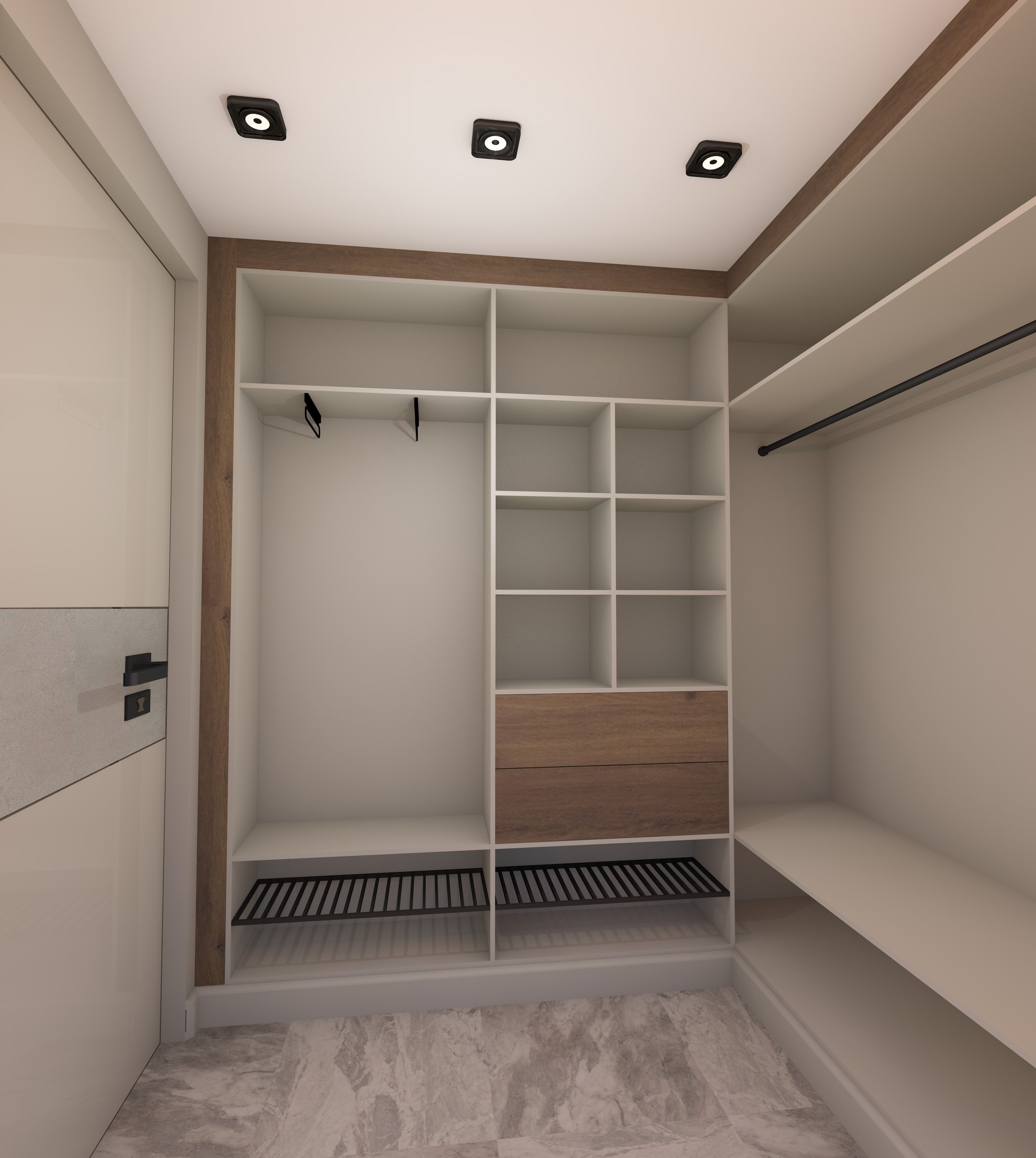 Перепланировка, современный стильный функциональный интерьер, серые оттенки, единая цветовая палитра, текстуры бетона, ровные линии, две гардеробные
