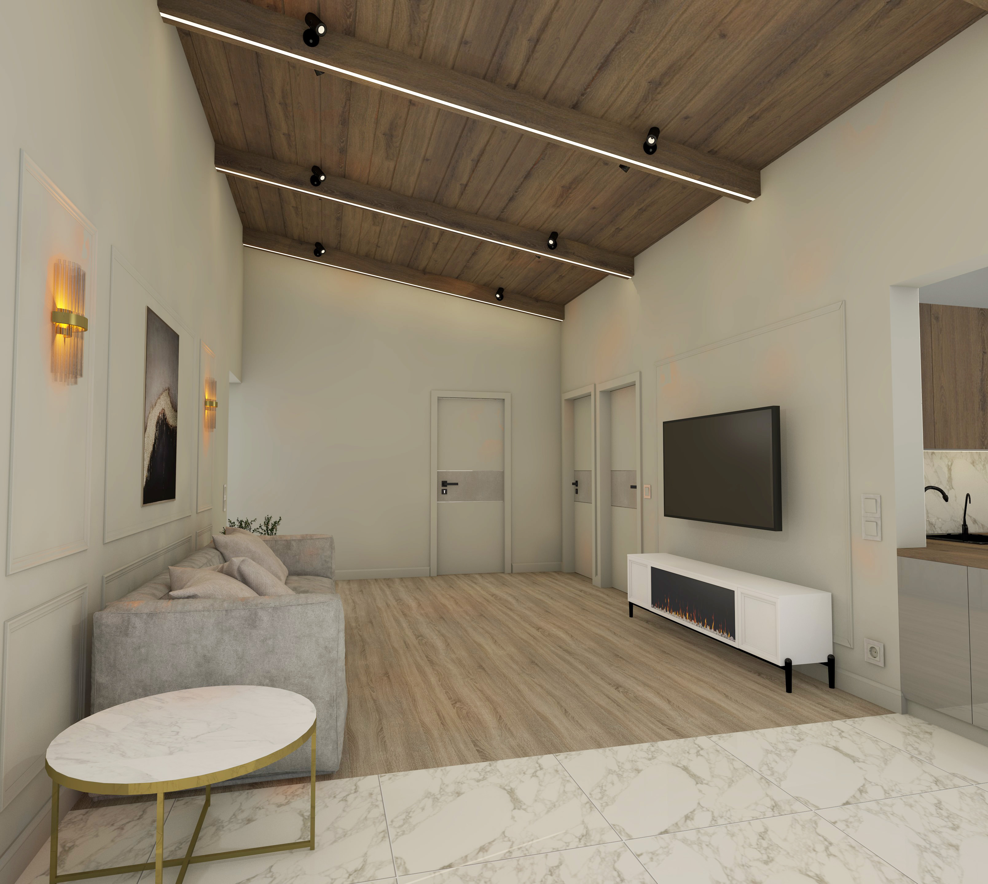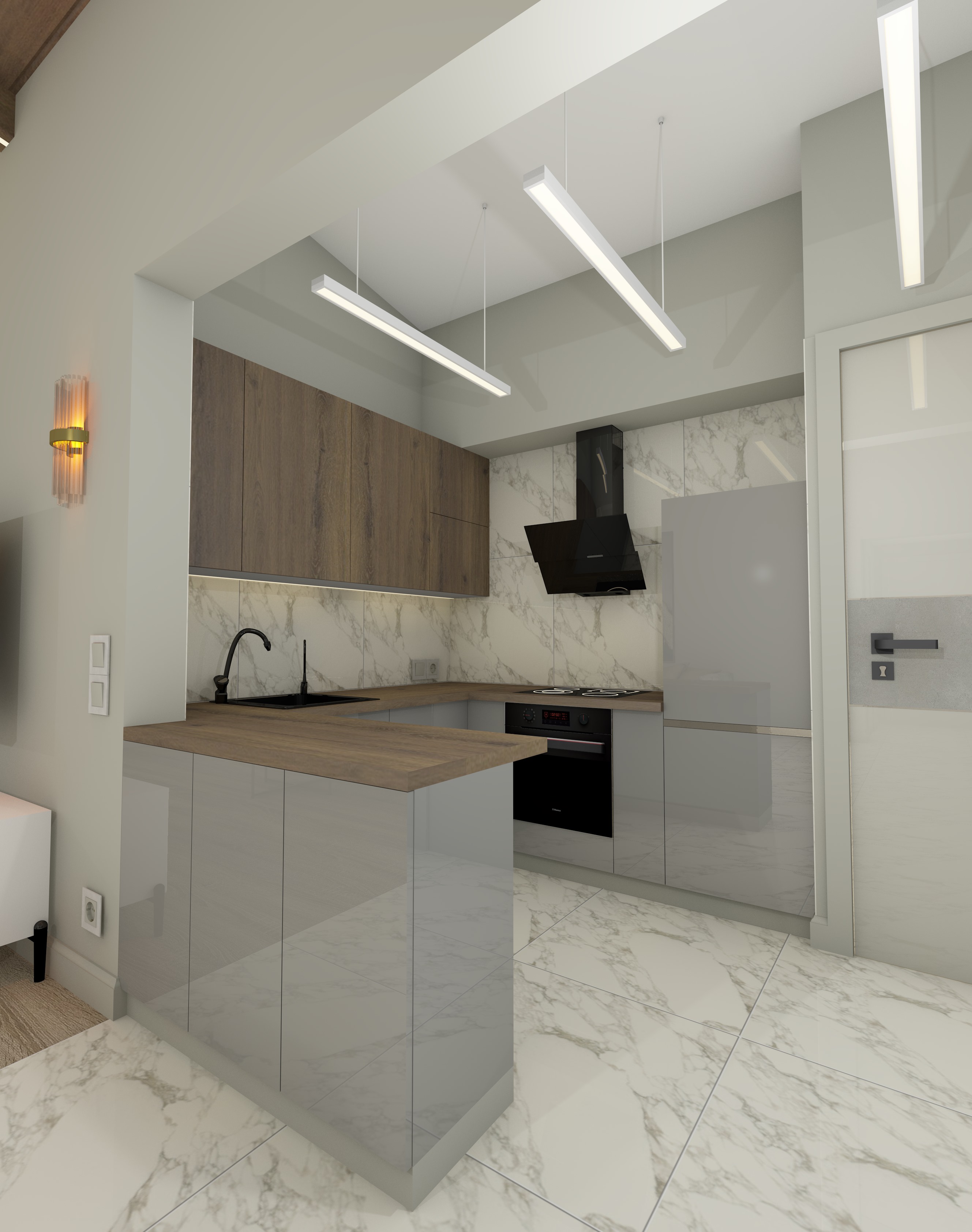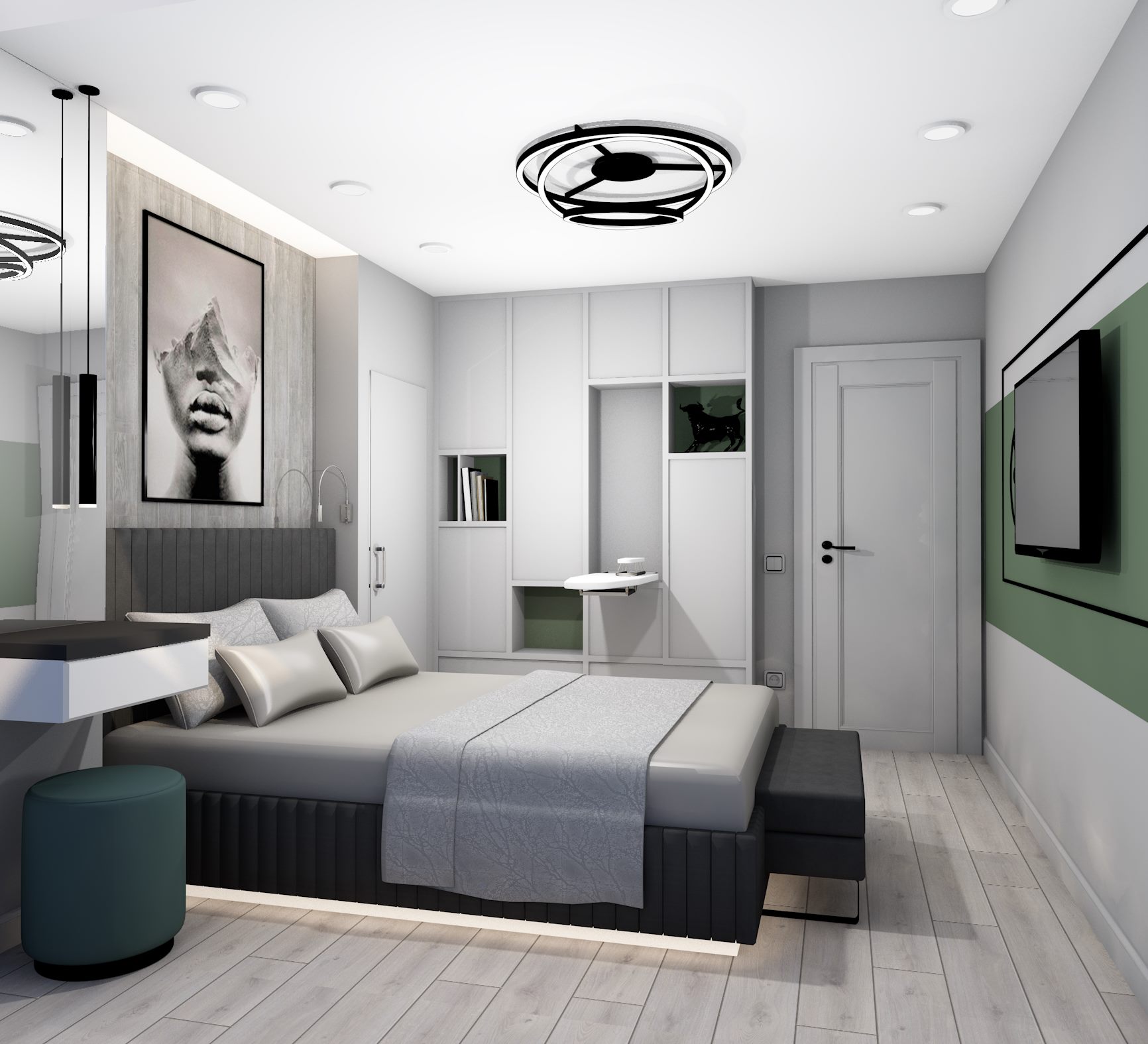 Перепланировка, современный стильный функциональный интерьер, серые оттенки, единая цветовая палитра, текстуры бетона, ровные линии, две гардеробные