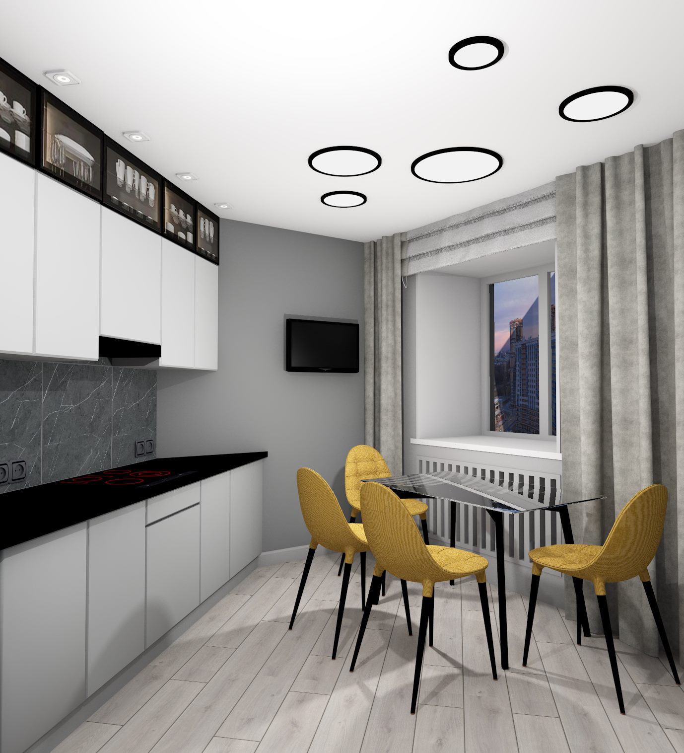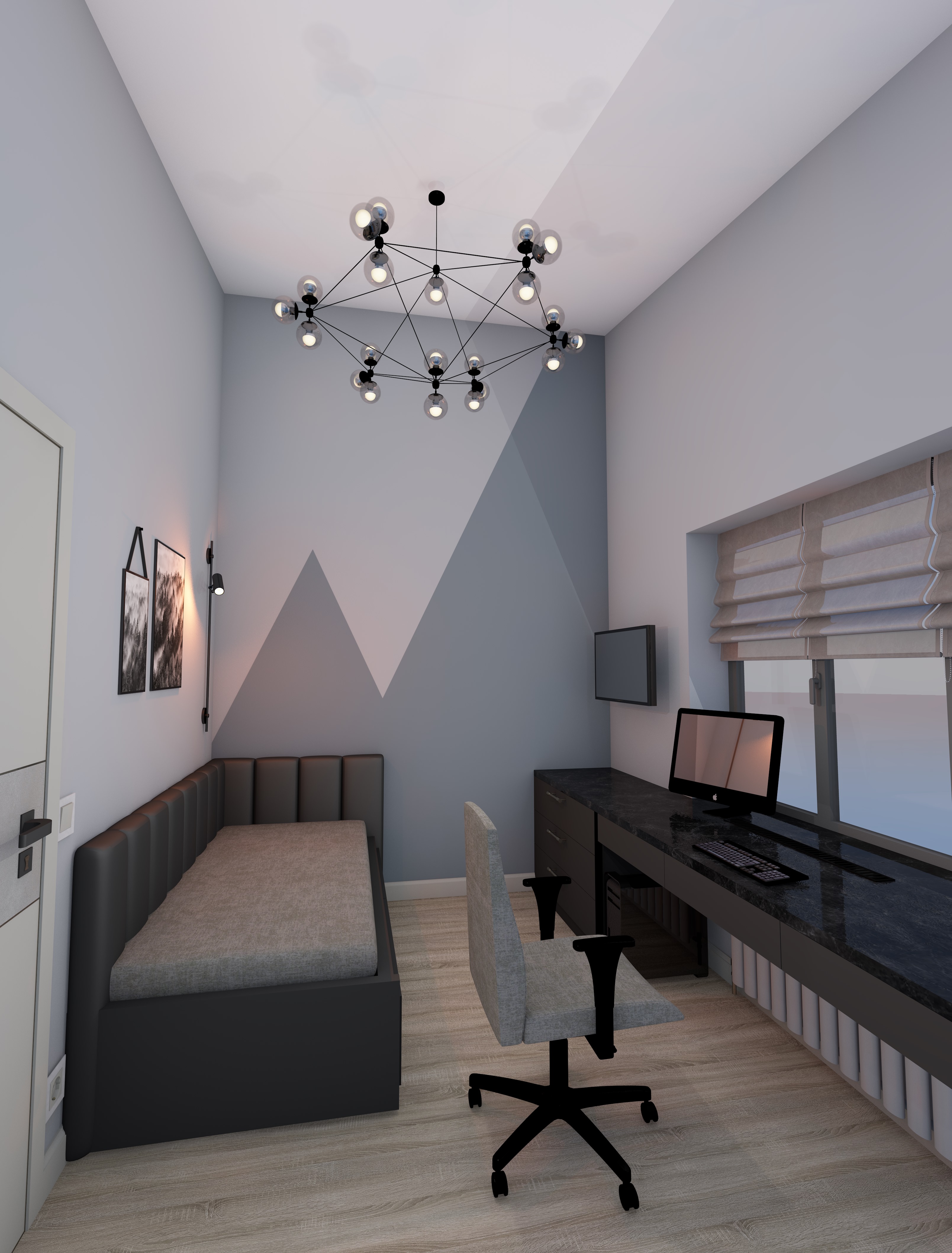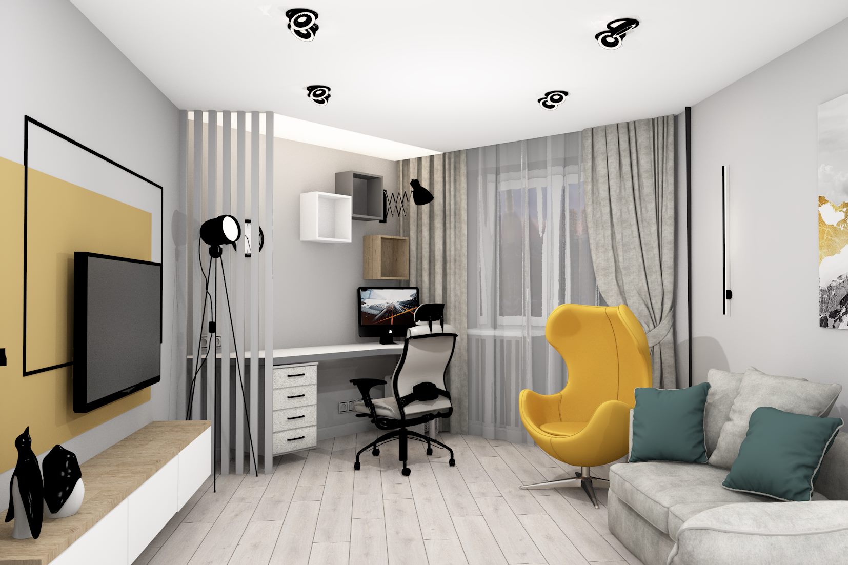 Предложены варианты перепланировки и компоновки мебели, по согласованному - выполнен дизайн-проект. Также, рассматривали несколько вариантов по цветовой гамме. В гостиной, кроме тв зоны, предусмотрено пространство для большого рабочего стола. В спальне расположена кровать, шкаф-стеллаж для хранения вещей, и консольный туалетный стол с зеркалом и подсветкой. Предусмотрено место для проживания питомца.
